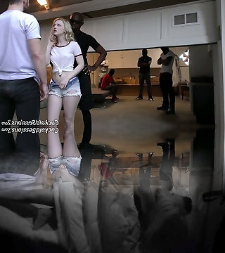 Super-steamy, blonde gal in black stockings and garter belt, Natalie Cherie is having group sex